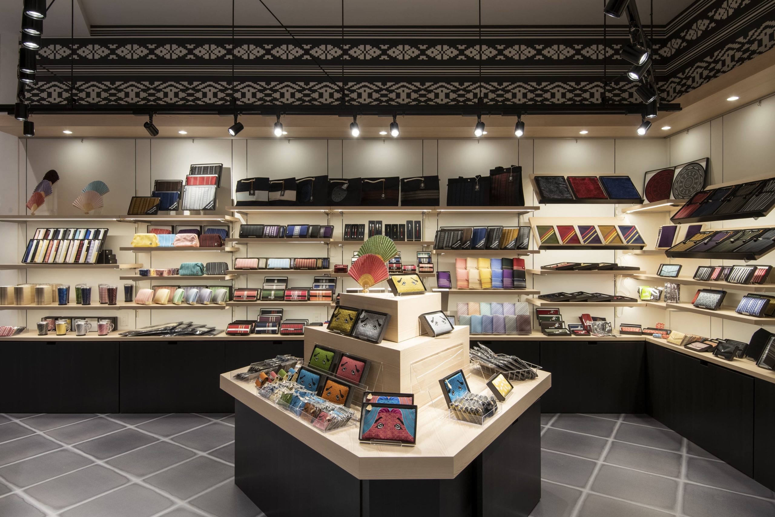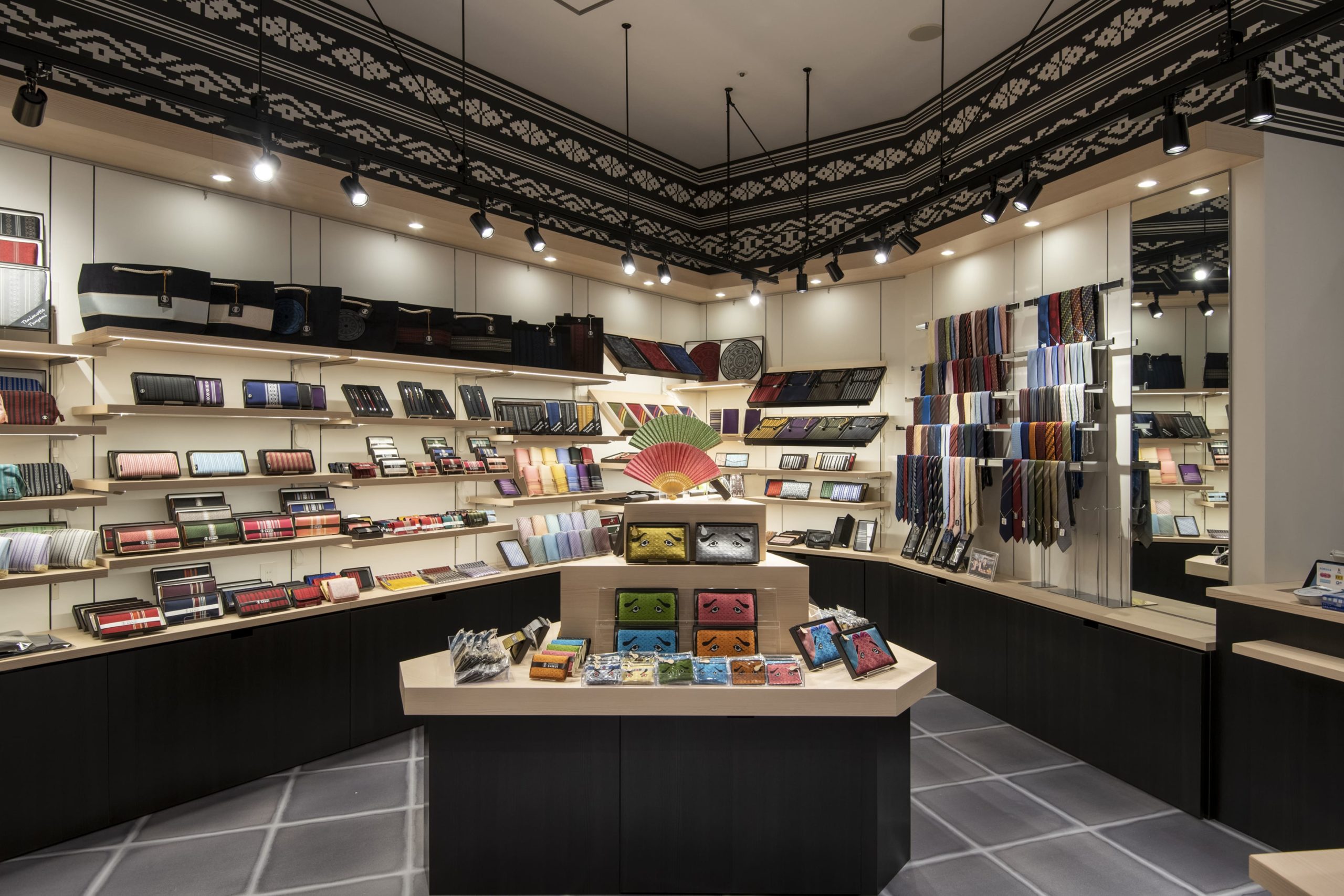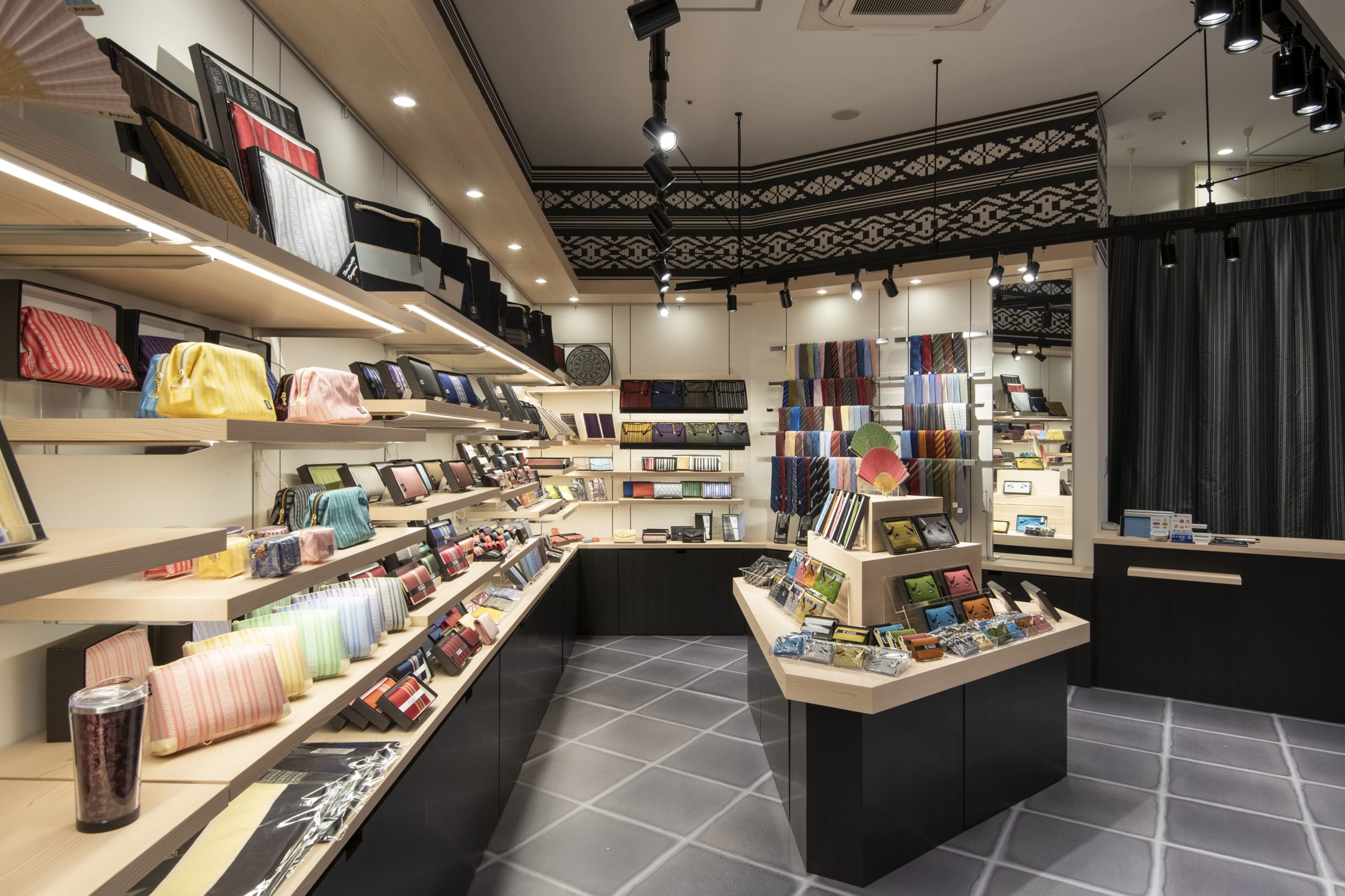 博多の伝統工芸品である「博多織」の専門店。博多織のデザインをモチーフにした 空間づくりを意識しました。歴史を紡いできた「技」を現代ニーズに合わせた 商品ラインナップで、普段使い・お土産など様々なシーンでお買い物を お楽しみいただけます。